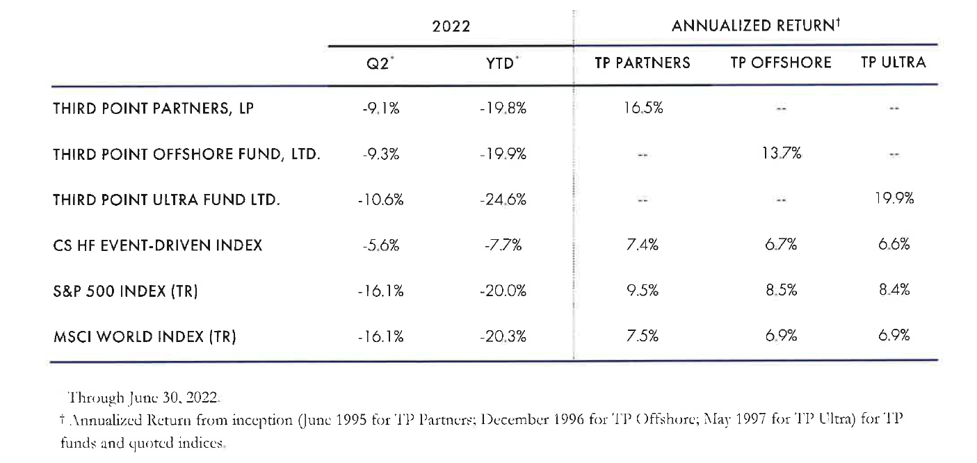 During the Second Quarter, Third Point returned -9.3% in the flagship Offshore Fund and -10.6% in the Ultra Fund. Assets under management on June 30, 2022, were approximately $13.8 billion.
