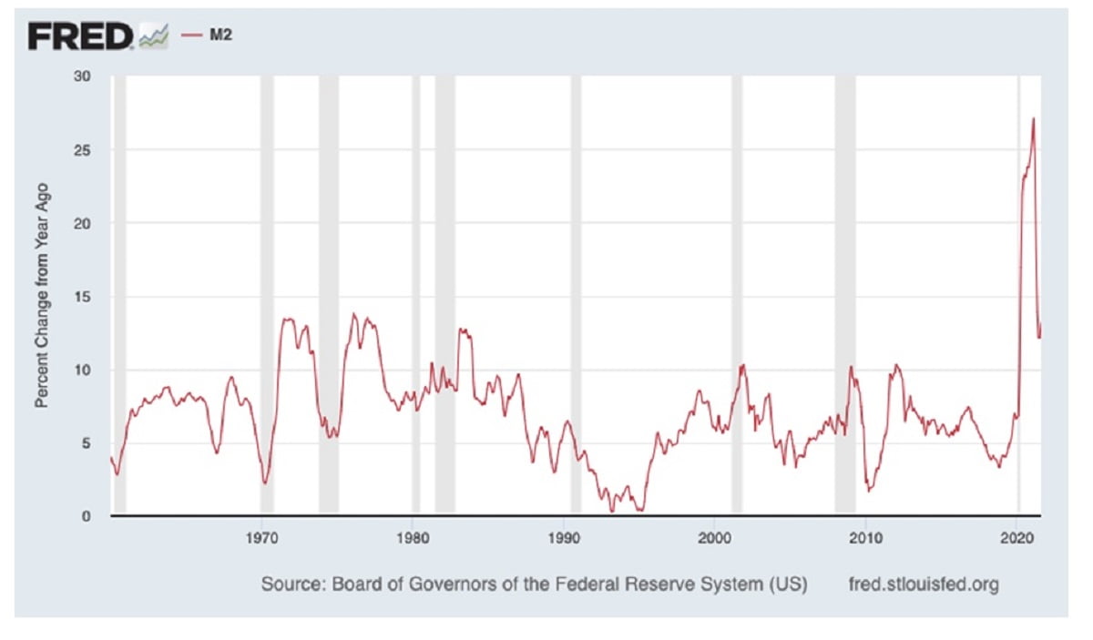 If the supply bottlenecks abate in the next six months – and that is a very big “if” – inflation should moderate, with decelerating M2 growth. In the meantime, to get a handle on the inflation situation, Powell likely wants 10-year Treasury yields higher, towards 2%. His language (given his hawk-like FOMC press conference) and his actions (the coming tapering) can do a lot to help Treasury yields reach that level.
