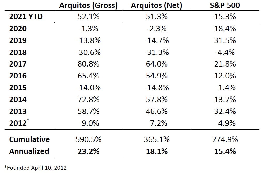 Arquitos returned 7.2% net of fees in the second quarter of 2021, bringing the year-to-date return to 51.3%.