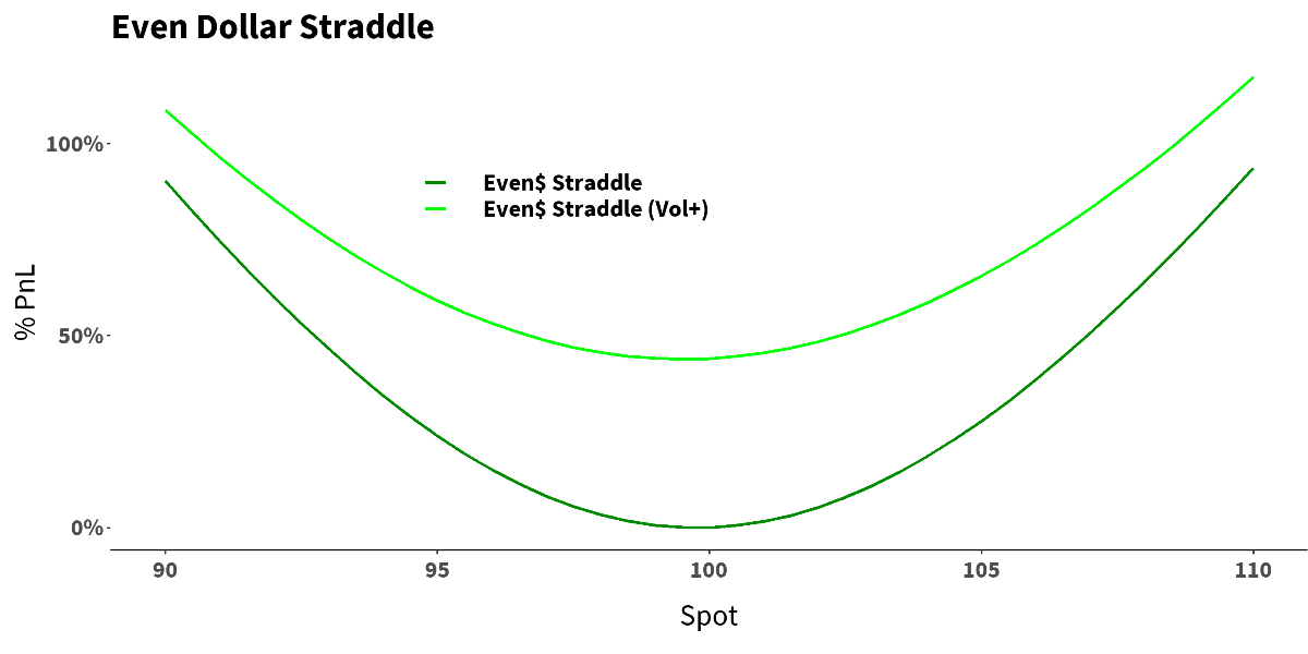 But on the heels of this month, we demonstrate below how beneficial a volatility tailwind can be. With a delta neutral straddle exposure, we can see the PnL profile dramatically moving in our favor with an 8.5 point increase in volatility (this illustration is simply the reverse of a prior 8.5 point volatility decay chart we included in our March 2021 letter that looked closely at vol deterioration):