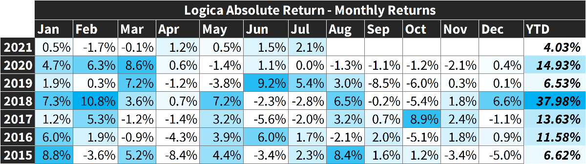 - Returns are Gross of fees. LAR Fund +1.98% (net), LTR Fund +0.87% for July 2021