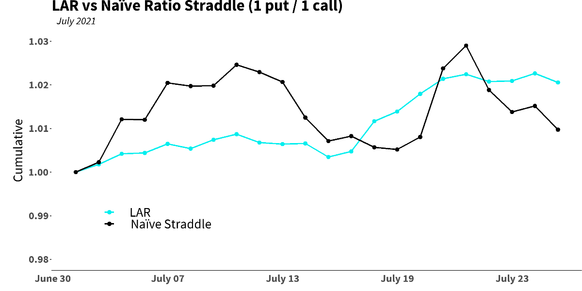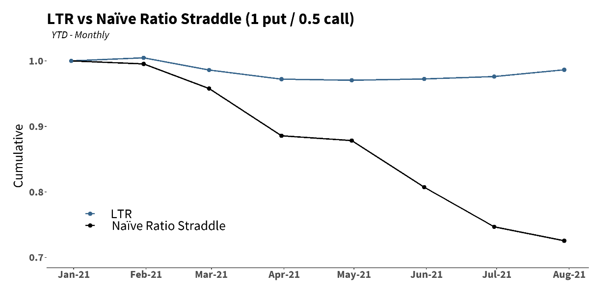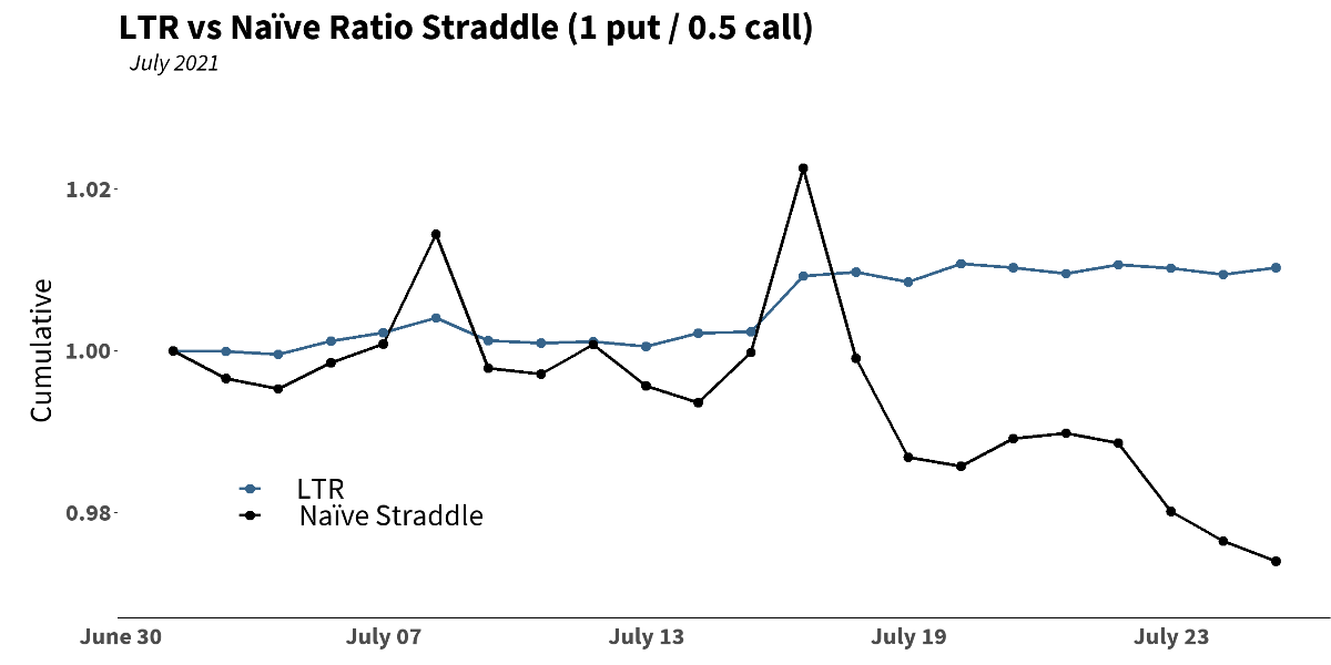 Both strategies nicely outpaced a naïve straddle in July. We continually see how a naïvely implemented (think “buy and hold”) strategy consistently fails to hold on to gains when volatility spikes: